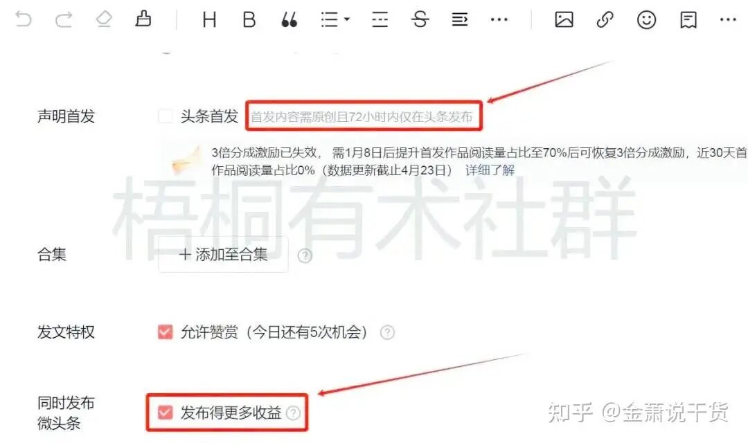 如下图所示,第一个箭头大家看到了吗?如果你想拿头条的三倍收益,就一定要有契约精神,发布到头条以后,72 小时以内就不要在其他平台发布了。如果你既想拿头条的三倍收益,又想拿其他平台的收益,最终的结果就是被头条处罚,永久取消你头条首发的权限。这一点大家一定要自己衡量好,别抱着侥幸心理想多拿收益,被头条发现了就得不偿失了。