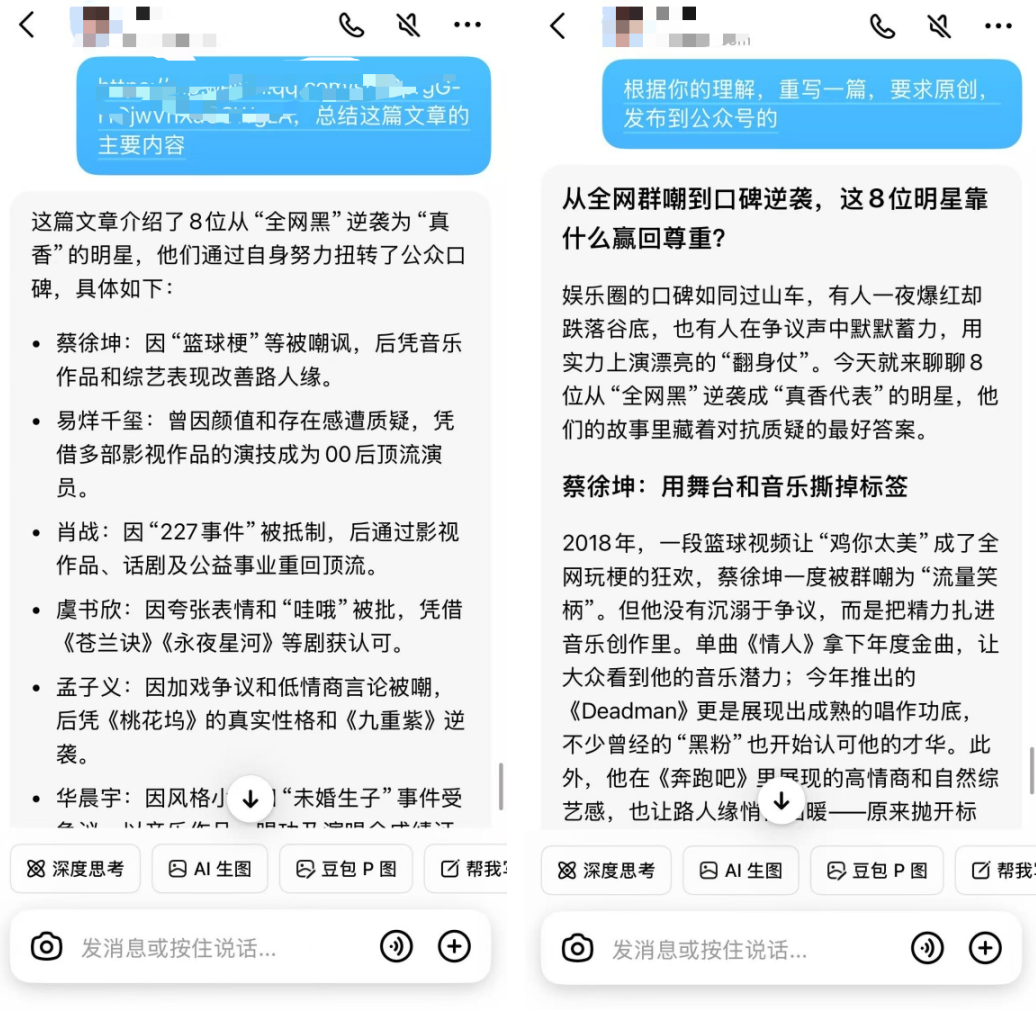 选一篇最近比较火的文章,把链接复制下来,发给豆包 AI,让它帮忙提炼出文章要点,再重新写一篇新的,不过可千万别直接用 AI 写的原文,最好自己再润色润色,比如调调内容顺序,加点自己的风格进去。