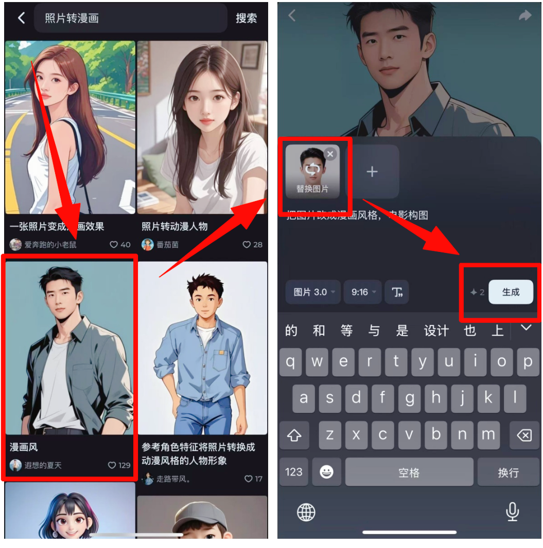 这里用到的是即梦 AI,直接在搜索框里输 “照片转漫画”,会出来不少不同风格的作品。挑一个你觉得不错的,点 “做同款” 就行。