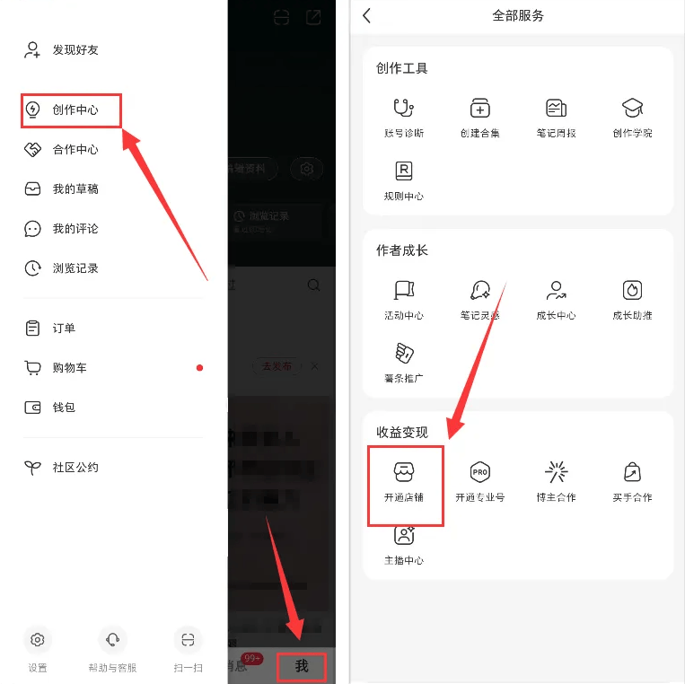 其实在小红书上开店一点都不难,操作步骤很简单:直接点开创作中心,找到 “全部服务”,点击开通店铺,然后按照平台提示一步步填写、提交资料,就能把店铺开起来了。