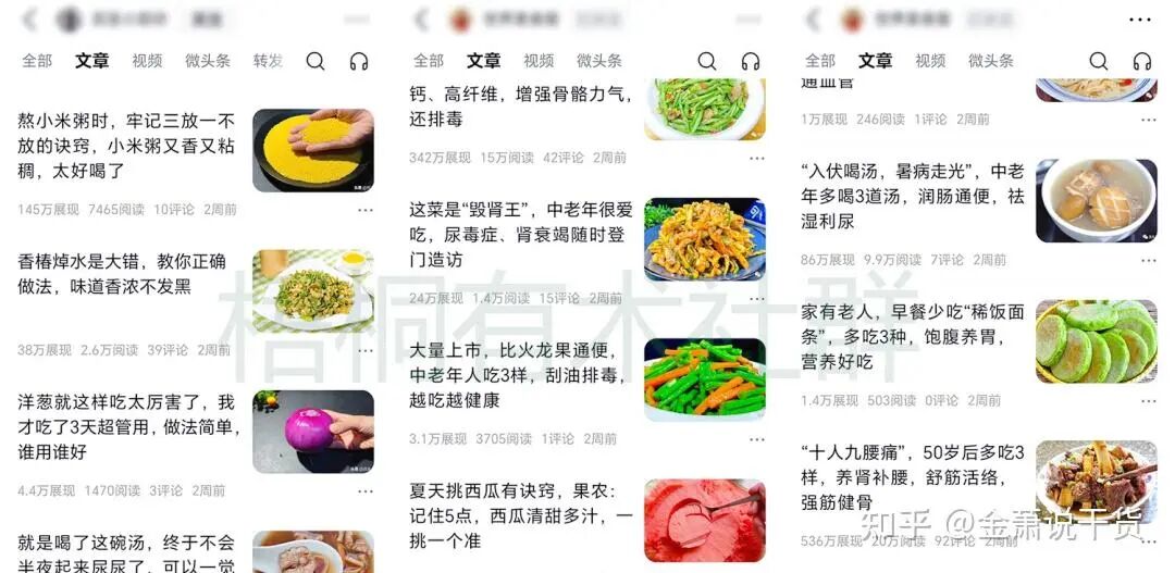 为啥选这个赛道呢?因为头条的用户大多是 30 岁以上的中老年人,用户上到七八十岁,下到三四十岁,谁还不关心自己的身体呢?像 “冬天别吃这 3 样”“血压高多吃这几个菜” 这类内容,自带流量,平台也愿意推,所以就算是新号也有可能被更多人看到。
