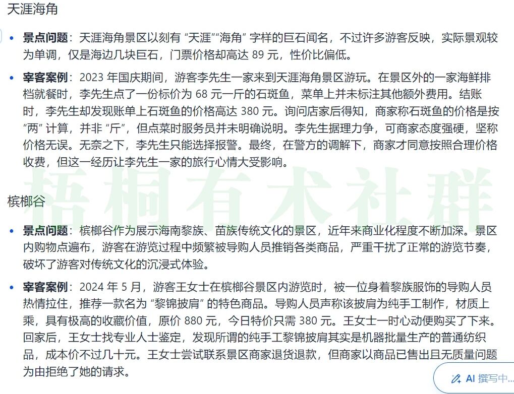 接下来咱们说说这类内容该怎么创作,而且写出来的内容绝对能申请原创。因为咱们用 AI 写的每一篇景点吐槽文,都融入了真实的游客被宰、被坑的案例,这些案例还都是曾经上过新闻的。大家可以看看下面这些游客在某景区或某地方被坑的例子。那怎么才能让 AI 把这些真实案例写到文章里去呢?方法很简单,就是给 AI 加一句提示词:结合以往游客被宰、被坑、被骗的真实新闻案例,填充到文章中,而且填充的案例一定要经过润色、改写,不能和新闻原文一模一样。