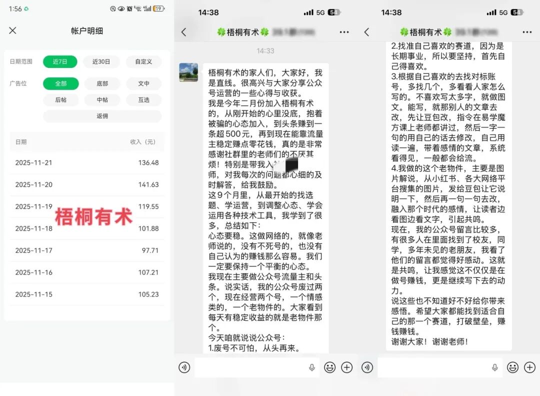 三、社群学员直线,公众号流量主单账号平均每天100多,收入非常的稳定。他做的是老物件赛道,这只是他其中一个账号,当然后面还会继续增加账号。同时操作几个账号,每天花1、2个小时发发内容,不比每天出去外面日晒雨淋的搬砖,要强的多。